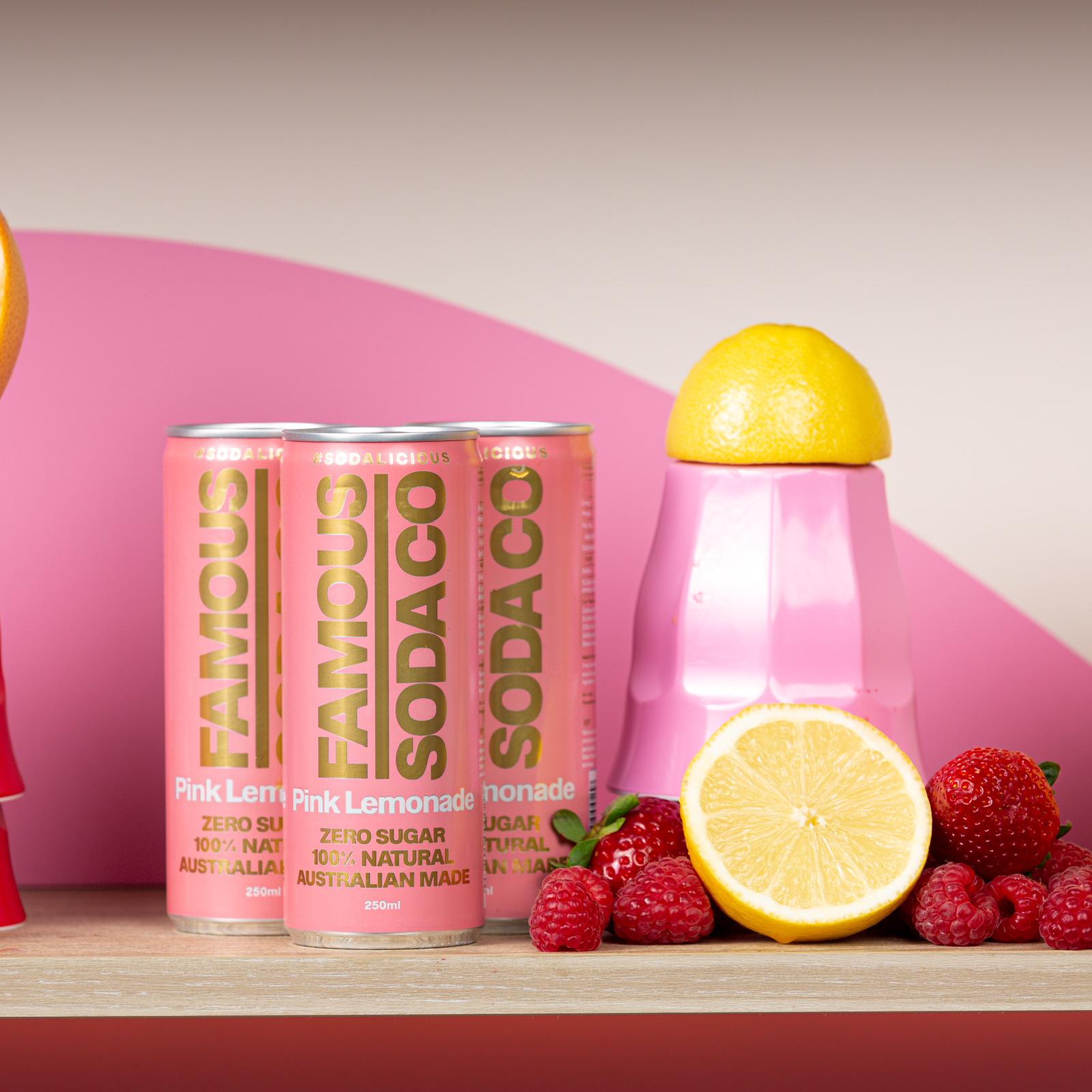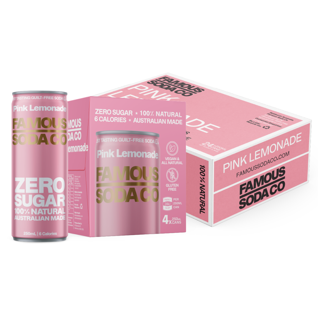 What sets our Pink Lemonade apart in the world of sugar free drinks is its ability to deliver a full-flavoured experience without the guilt. Packaged in a convenient 24-pack of 250ml cans, Famous Soda Pink Lemonade is always ready to quench your thirst and add a pop of colour to your day. Whether you're packing a picnic, need a refreshing post-workout drink, or are simply craving a crisp, fruity soda, our Pink Lemonade rises to every occasion.